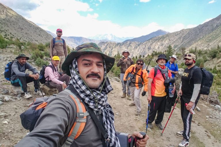 جیپ ڈرائیور کی فاش غلطی مگر قدرت کی مہربانی سے جیپ کھائی میں گرنے سے بچ گئی۔ جب اک حادثے سے بچ نکلے تو نانگا پربت کے ہیئرلش کوفر(Herrligkoffer) بیس کیمپ اور پھر بزہن گلیشیئر کو عبور کرتے ہوئے ٹاپ میدان اور لاتوبو بیس کیمپ کا ٹریک کرنے کے لئے وادی روپل سے روانگی کے وقت بنائی گئی منہ فوٹو شریف۔۔۔ شریف اس لئے کہ فوٹو میں سوائے منظرباز کے سبھی شریف لوگ ہیں۔ ویسے بھی ایک گروہ میں ایک ہی غنڈہ ہوتا ہے اور اس گروہ کا غنڈہ۔۔۔ 😉 😛