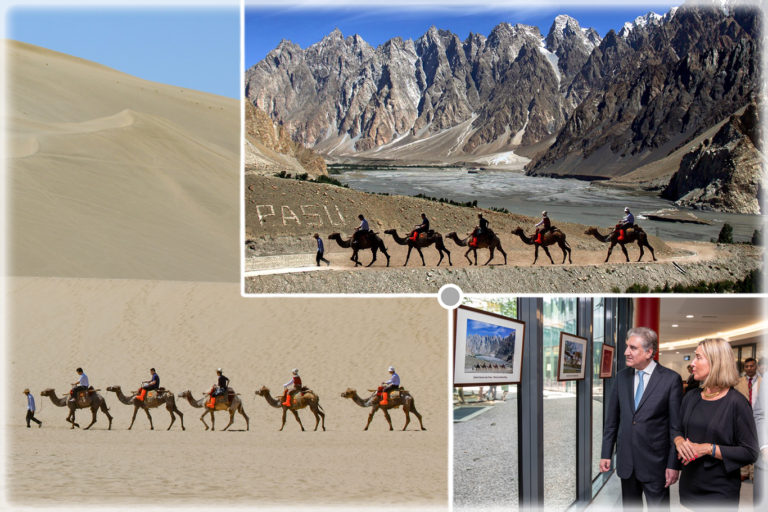 امید ہے آپ سمجھ گئے ہوں گے کہ نمائش میں ایک ”چمتکاری تصویر“ ایسی بھی ہے جو شمال و جنوب کی تصویریں جوڑ کر بنائی گئی۔ جوڑی گئی تصویروں میں سے ایک تصویر چین کے علاقے دُن ہوانگ(Dunhuang) میں ”ریت کے نغمہ سرا ٹیلوں“(Singing Sand Dunes)میں سے گزرتے اونٹوں کے ایک کارواں کی ہے۔ جبکہ دوسری تصویر پسوکونز(گوجال، ہنزہ) کی ہے۔ یوں دونوں تصویریں ملا کر ایک نئی تصویر بنائی گئی، جس میں پسو کے قریب شاہراہ قراقرم پر اونٹوں کا کارواں دکھایا گیا۔ بھلا اس قسم کے اونٹوں کا ایسا کارواں پسو میں کہاں سے آیا؟ یا اس جیسے دیگر سوالات تو اپنی جگہ، جبکہ میں نے اس چمتکاری تصویر کو دیکھ کر سر پکڑ لیا۔ کیونکہ کارواں کو پسو کونز کی تصویر میں اس بے دردی سے ٹھوکا گیا ہے کہ ایک عام بندہ بھی پہلی نظر میں پکار اٹھتا ہے ”فوٹوشاپ ای اوئے فوٹوشاپ ای“۔۔۔ اس تصویر میں ایڈیٹنگ کی بڑی فاش غلطیاں موجود ہیں۔ مثلاً حجم کے حساب سے اونٹ اپنے اردگرد کے ماحول سے مطابقت نہیں رکھتے۔ پہاڑوں پر اگر مشرق سے روشنی پڑ رہی ہے تو اونٹوں اور شتربانوں کا سورج مغرب میں پہنچ چکا ہے۔ میری نظر میں اس تصویر کا حال وہی ہے کہ جیسے کسی ریڑھی بان نے اپنی ریڑھی والی تصویر میں ایشوریا رائے کو ساتھ لا بیٹھایا۔ ایسی مزاحیہ تصویروں سے انٹرنیٹ بھرا پڑا ہے۔ ہر کوئی اپنا اپنا چاند اپنی اپنی ریڑھی پر بیٹھائے پھر رہا ہے اور سورج کی شعاعوں کی مت مار رہا ہے۔ خیر فوٹوگرافی کے بلاتکار والے ایسے معاملات عام بندہ بھی عموماً آسانی سے پہچان لیتا ہے جبکہ مدعا تو یہ ہے کہ اس چمتکار کو نہیں پہچانا تو نمائش کی انتظامیہ نے نہیں پہچانا اور نمائش بھی وہ کہ جس کا افتتاح شاہ محمود قریشی صاحب نے یورپی یونین کمیشن کی وائس پریزیڈنٹ صاحبہ کے ساتھ مل کر کیا۔ افتتاح اور نمائش دیکھنے کی بھی تصویریں بنیں اور وہی تصویریں پورپیئن ایکسٹرنل ایکشن سروس نے ٹویٹ بھی کر دیں۔ اس ٹویٹ میں اتفاق سے ایک تصویر وہ بھی تھی کہ جس میں شاہ صاحب اور وائس پریذیڈنٹ صاحبہ اُس چونا لگاتی تصویر کے عین سامنے ہیں۔