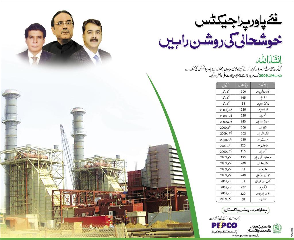 ہم حکومت سے صرف یہ پوچھنا چاہتے ہیں کہ وہ نئے پاور پراجیکٹس کہاں ہیں؟ وہ خوشحالی کی روشن راہیں کہاں گم ہو گئیں؟ وہ دسمبر 2009 تک ملنے والی ساڑھے 3 ہزار میگا واٹ بجلی کونسی زمین نگل گئی؟ آپ کا عزم اور اس کے تحت روشن پاکستان کہاں ہے؟ پاکستان میں توانائی کے شعبے کی نئی جہت تو کہیں نظر نہیں آ رہی۔ پاکستان الیکٹرک پاور کمپنی کیا بس نام کی ہی تھی؟ روشن پاکستان کے خواب دیکھانے والوں کو صرف اتنا کہنا چاہتا ہوں کہ روشن پاکستان کی عوام آج بھی پندرہ پندرہ گھنٹے کی لوڈ شیڈنگ برداشت کر رہی ہے۔ طالب علم موم بتیاں جلا کر پڑھنے پر مجبور ہیں۔ کارخانے بند ہو رہے ہیں۔ مزدور بے روزگار ہو رہیں۔ مگر آپ کروڑوں کے اشتہارات دے کر آخر کیا ثابت کرنا چاہ رہے ہیں؟