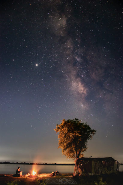 اور پھر ایک شام کے قریب ہم دوست احباب حسبِ معمول اپنی ”فرائیڈے یاترا“ کو نکلے۔ آسمان پر کافی بادل تھے اور کہکشاں نظر آنے کا بالکل بھی امکان نہ تھا، اس لئے کیمرہ وغیرہ ساتھ نہ لیا۔ چناب کنارے پہنچے تو یہ سوچ کر درویش کی کُٹیا کی طرف جانے کا ارادہ بن گیا کہ کیا معلوم آج رات وہ بہہ جائے۔ دراصل اوپر (پہاڑوں پر) بارشیں ہونے کی وجہ سے دریا میں پانی معمول سے کافی زیادہ اور کنارے سے تھوڑا ہی نیچے تھا۔ ویسے بھی حکومت کی طرف سے سیلاب کی تنبیہ ہو چکی تھی۔ خیر بمبوکاٹ بند پر کھڑے کیے اور پیدل نیچے اتر کر چل دیئے۔ کُٹیا میں پہنچ کر درویش سے سلام دعا کے بعد گفتگو ہونے لگی۔ تھوڑی دیر بعد ایویں باہر نکل کر دیکھا تو حیرت انگیز طور پر بادل غائب ہو چکے تھے اور آسمان شدید صاف تھا۔ بس پھر میری تو دوڑیں لگ گئیں۔ عباس مرزا کو کہا کہ تم یہیں گپ شپ کرو اور میں جلدی سے کیمرہ لے کر آیا۔ جب واپس بند کی طرف جا رہا تھا تو دیکھا کہ پانی کی سطح پہلے سے بلند ہو چکی ہے۔ اور جب بھاگم بھاگ کیمرہ لے کر واپس کنارے پر پہنچا تو سطح خطرناک حد تک بلند ہو چکی تھی۔ اک طرف پانی مزید بڑھنے کا خطرہ تو دوسری طرف گلیکسی کا نظارہ، جو کہ ہمارے اِدھر سال بھر میں چند ایک بار ہی ایسا شفاف دیکھنے کو ملتا ہے۔ ویسے بھی اگر سیلاب آیا تو عین کنارے پر بنی کُٹیا بہہ جائے گی اور پھر کون جانے کہ ایسا موقع کب اور کہاں ملے۔ ملے بھی یا نہ ملے۔ لہٰذا میں یہ موقع گنوانا نہیں چاہتا تھا۔ اور پھر کُٹیا کے قریب ہم فوٹوگرافی کرنے لگے۔ اسی دوران یہ تصویر بھی بنائی کہ جس میں عباس مرزا ”درویشی مَچ“ کے پاس بیٹھا ہے۔ ابھی سٹار ٹریل اور گلیکسی کا ٹائم لیپس بنانا تھا کہ عباس مرزا کو گھر لوٹنا پڑا، مگر منظرباز۔۔۔ ”عشق بلھے نوں نچاوے یار تے نچنا پیندا اے… مل جاوے دیدار تے نچنا پیندا اے… سامنے ہووے یار تے نچنا پیندا اے“۔۔۔