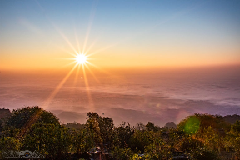 مقامِ طلوع پر پہنچ کر ہم عجب کیفیات سے دوچار ہوئے۔ ابھی سورج نہیں نکلا تھا اور شفق کی روشنی لاجواب تھی۔ نیچے وادی میں کہیں کہیں دھند کا پہرہ تھا۔ ہلکی ہلکی پُروا یعنی بادِصبا، نسیم سحر چل رہی تھی۔ وہ منظرنامہ شدید الشدید دلفریب تھا۔ اور جب منظرباز ایسے نظاروں میں محو ہوتا ہے تو ”تم“ میں کھو جاتا ہے۔۔۔ خیر پھر ویڈیو کے لئے طلوعِ آفتاب کا ٹائم لیپس لگایا، کچھ تصویریں بنائیں اور پھر دوبارہ نظارے جذب کرنے لگے۔ اور جب سورج کی ترچھی شعاعیں ٹلہ پر پڑ رہی تھیں تو تب ”پرندو بادشاہ“ نے اڑان بھری اور پورے ٹلہ جوگیاں کے گرد کوئی سوا کلومیٹر کا چکر لگا کر ویڈیو بنائی۔ ادھر پرندو کا چکر مکمل ہوا تو اُدھر سورج کی انگڑائیاں تھوڑی شدت اختیار کرنے لگیں، اور یہ تصویر تب بنائی۔ اور فوراً کیمرہ سکرین پر پاس کھڑے دوستوں کو دکھائی کہ تم گواہ رہنا، سورج کی شعاعیں ایسے ہی کیپچر کی تھیں، بعد میں کوئی ایڈیٹنگ کوئی فوٹوشاپی نہیں۔۔۔ اس پر ذوالقرنین المعروف ذوقی اور مریم عتیق صاحبہ نے کہا ”وہ تو ٹھیک ہے لیکن یہ شعاعیں ایسے کیسے بنیں؟“ الجواب: اپنی آنکھوں کو تھوڑا بند کر کے کبھی کسی بلب کی طرف دیکھنا۔ بس پھر شعاعیں بننے کا جواب مل جائے گا اور وہی تکنیک یہ تصویر بناتے ہوئے استعمال کی ہے، یعنی کیمرے کی آنکھ (اپرچر) کو تھوڑا بند کر دیا تھا۔۔۔ بس جی! اب ہمارے ٹیوٹوریلز باقاعدہ لمبے چوڑے لیکچر نہیں ہوتے، بلکہ ایسے ہی ہلکے پھلکے انداز میں کئی باتیں بتا جاتے ہیں۔ شوق والے سمجھ جاتے ہیں اور باقی نظر انداز کر کے نکل جاتے ہیں۔ اب آپ آنکھیں تھوڑی سی بند کر کے بلب کو دیکھنا چھوڑیں اور بقیہ تحریر پڑھیں، جو کہ تھوڑی سی رہ گئی ہے۔